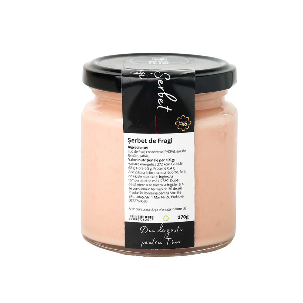 Adâncește-te în plăcerea verii cu sorbetul de fragi Mos Ilie. Din fragi salbatice sau de cultura, culese manual s-a creat acest deliciu prafumat. Numai bun pentru ca insotitor pentru deserturi sau se poate servi simplu, alaturi de un pahar cu apa rece. Fragi Proaspeți și Suculenți: Selecționăm fragi maturi și suculenți pentru a oferi o experiență autentică și intensă a gustului.