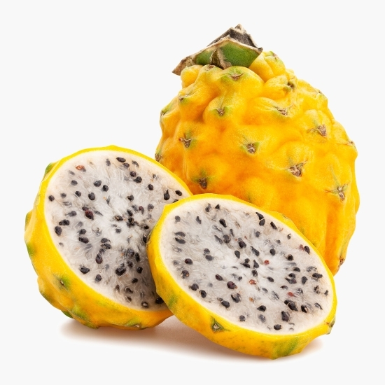 Fructul Dragonului Galben este un superfruct tropical, cu o coajă galbenă vibrantă și o pulpă albă, suculentă și dulce. Acest fruct exotic are o textură crocantă datorită semințelor sale mici, iar gustul său dulce și ușor acidulat îl face perfect pentru a adăuga un strop de prospețime salatelor, smoothie-urilor sau deserturilor. Recoltat din Ecuador, Dragonul Galben aduce un gust unic din inima tropicelor, ideal pentru a fi savurat ca atare sau ca ingredient principal în diverse preparate.