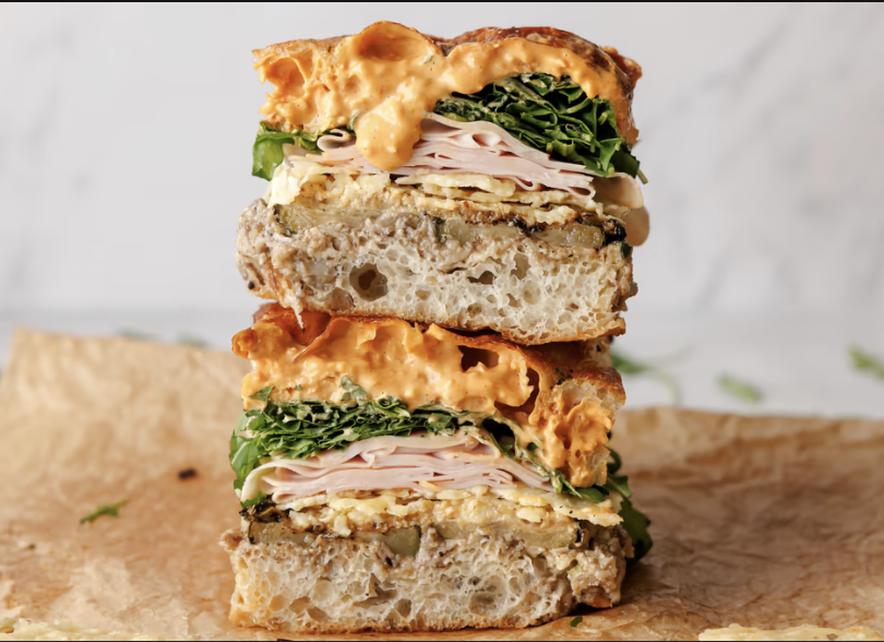 Focaccia coapta azi, cotto de curcan, chips de parmezan, zucchini la grătar, crema de ciuperci si trufe, salata mixta, sos Algeriene - 400-450g