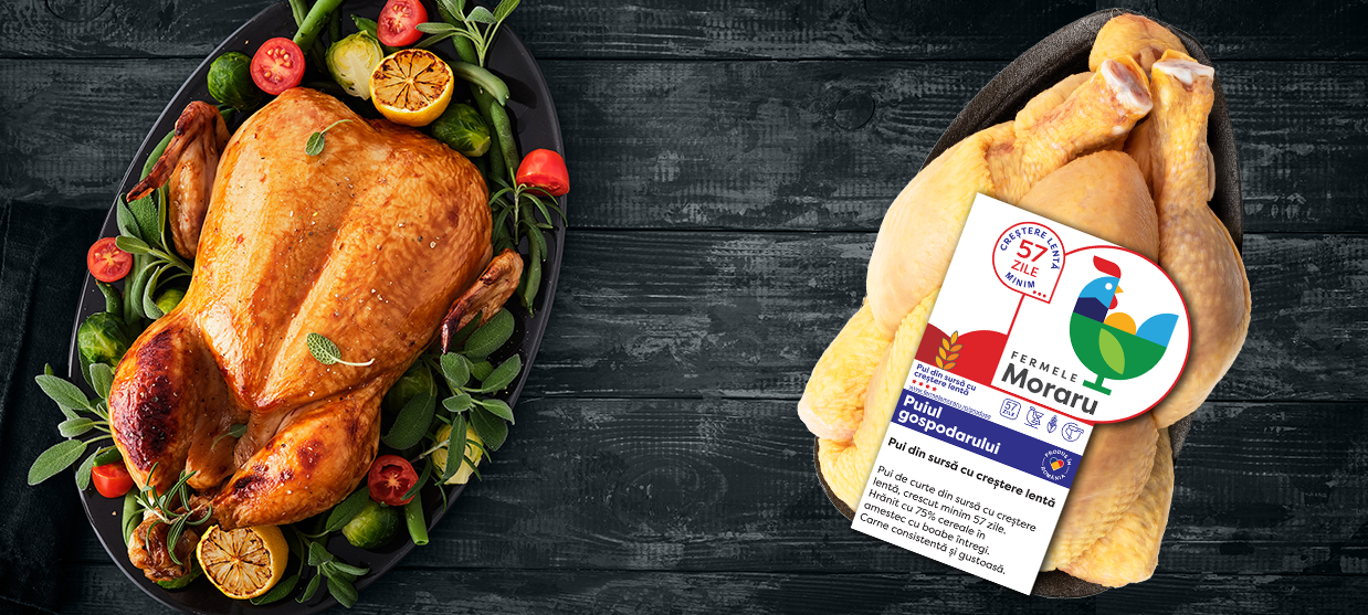 Puiul gospodarului este crescut cu grijă în fermele Moraru și aduce pe piață pasărea de curte, din rasa Hubbard care se remarcă prin penajul său colorat. Adăpostiți în hale, acești pui au posibilitatea de a ieși afară iar perioada minimă de creștere este de 65 de zile. Această rasă este folosită atât pentru carne, cât și pentru ouă. Carnea lor are o culoare galbenă, datorată penajului și a dietei specifice, boabe întregi de cereale. Este produsul perfect pentru preparatele tradiționale, precum ciorbele, borșul și răciturile.