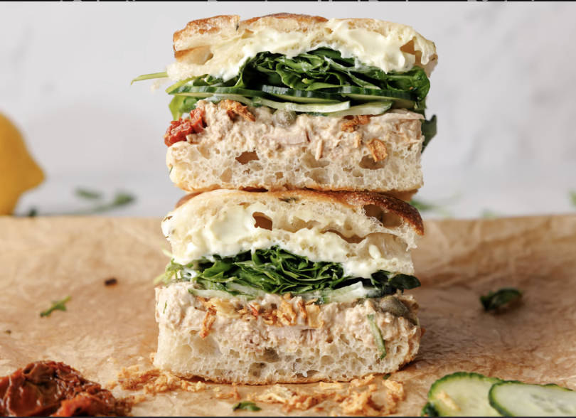 Focaccia coapta azi, salata de ton făcută de noi, roșii uscate, capere, castraveți, rucola, maioneza cu wasabi - 400-450g