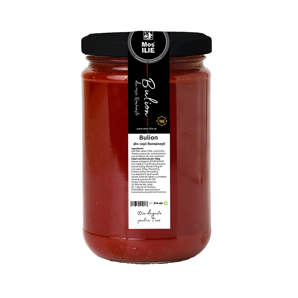 Îmbogățește-ți preparatele cu bulionul de roșii, o delicatesă esențială în bucătărie, care aduce un gust intens și autentic. Preparat din roșii coapte, zahăr și sare, acest bulion oferă o aromă bogată și profundă, perfectă pentru sosuri, supe și tocănițe.